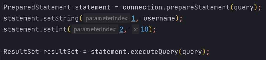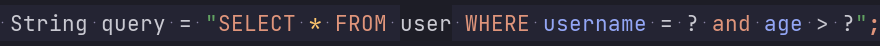 In diesem Beispiel, werden nur Einträge zurückgeliefert, welche die Kriterien username = ‘gandalf’ und age > 20 erfüllen. Wenn nun dieselbe Anweisung mehrmals ausgeführt werden soll aber jeweils mit anderen Parameter (also mit unterschiedlichen username und age), wird die Anweisung mit Platzhaltern wie folgt geschrieben (ein Fragezeichen dient als einen Platzhalter):