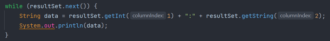 Im obigen Beispiel wird die next Methode verwendet um den Cursor jeweils eine Zeile vorwärtszubewegen. Aus jeder Zeile werden aus dem ResultSet mittels getXXX Methoden (XXX steht für den Typ des Wertes) die Werte, welche in dieser aktuellen Zeile vorhanden sind. Die getXXX Methoden, bekommen als Parameter entweder die Spaltenposition oder den Spaltennamen, welche gelesen werden soll. Bei einer Spaltenposition hat die erste zurückgelieferte Spalte die Position 1. Hinter der letzten Zeile liefert die next Methode false zurück und somit wird die Schleife beendet, nachdem alle Zeilen bearbeitet worden sind.