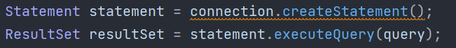 Im folgenden Beispiel wird die ein Statement-Objekt mithilfe des Connection-Objekt erstellt. Danach wird die Methode executeQuery verwendet, welche eine SQL-Anweisung als Parameter entgegennimmt, diese ausführt und eine Referenz auf die Ergebnismenge (sog. ResultSet) zurückliefert: