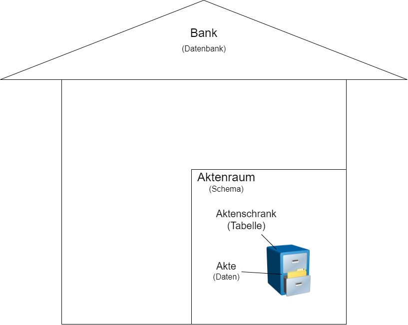 - Ganz oben steht die Datenbank an sich. Sie ist vergleichbar mit dem Gebäude einer Bank, in dem sich die Infrastruktur sowie das Geld befinden.
